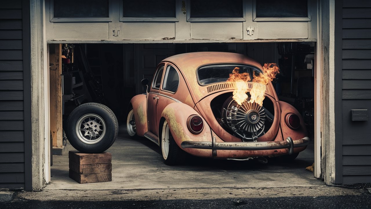 The garage door is open - in the driveway is what looks like a burnt out auto (a Volkswagen rabbit) . It’s still burning, it makes the same burning first noise as the heater in the new house. It’s gotta be a furnace - but the flames seem to not be very efficient.