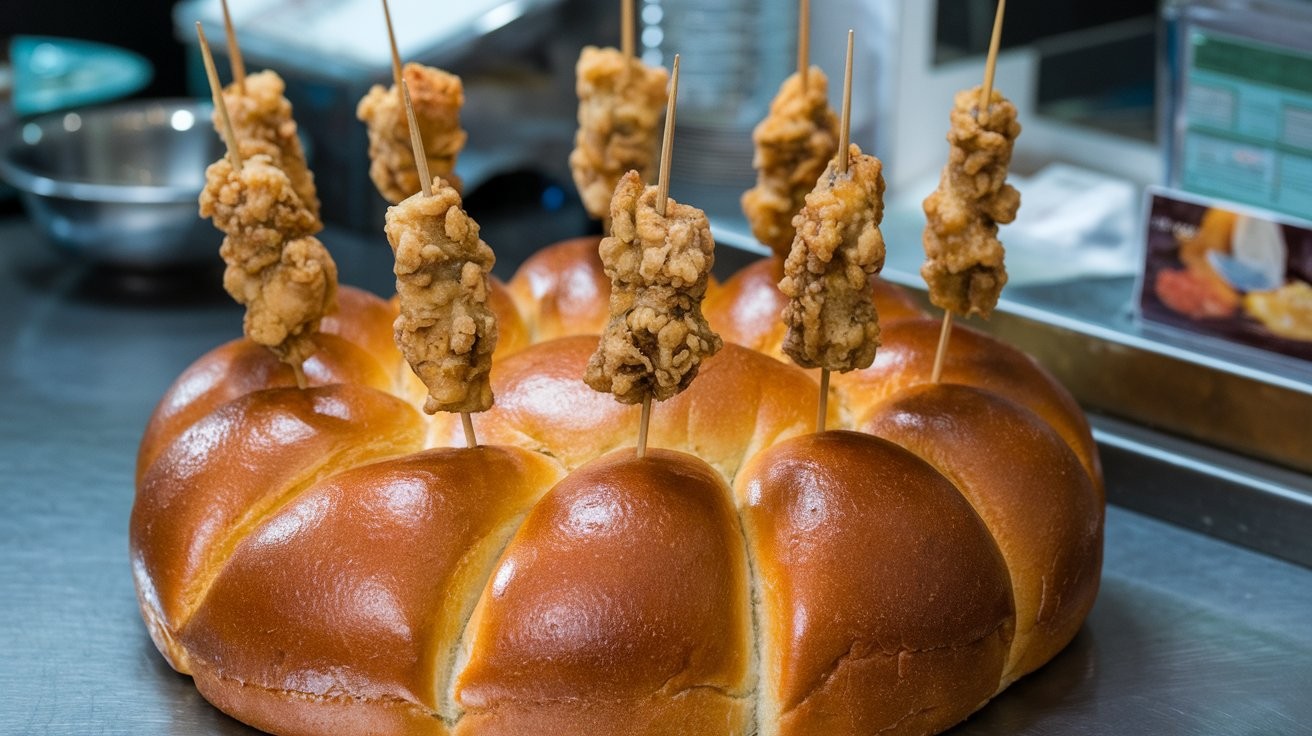 Fried chicken, similar to Louisiana fried chicken, each one on a stick. They weren't like corn dogs, but the squewer was punching threw the middle to look like it was balancing the meat.